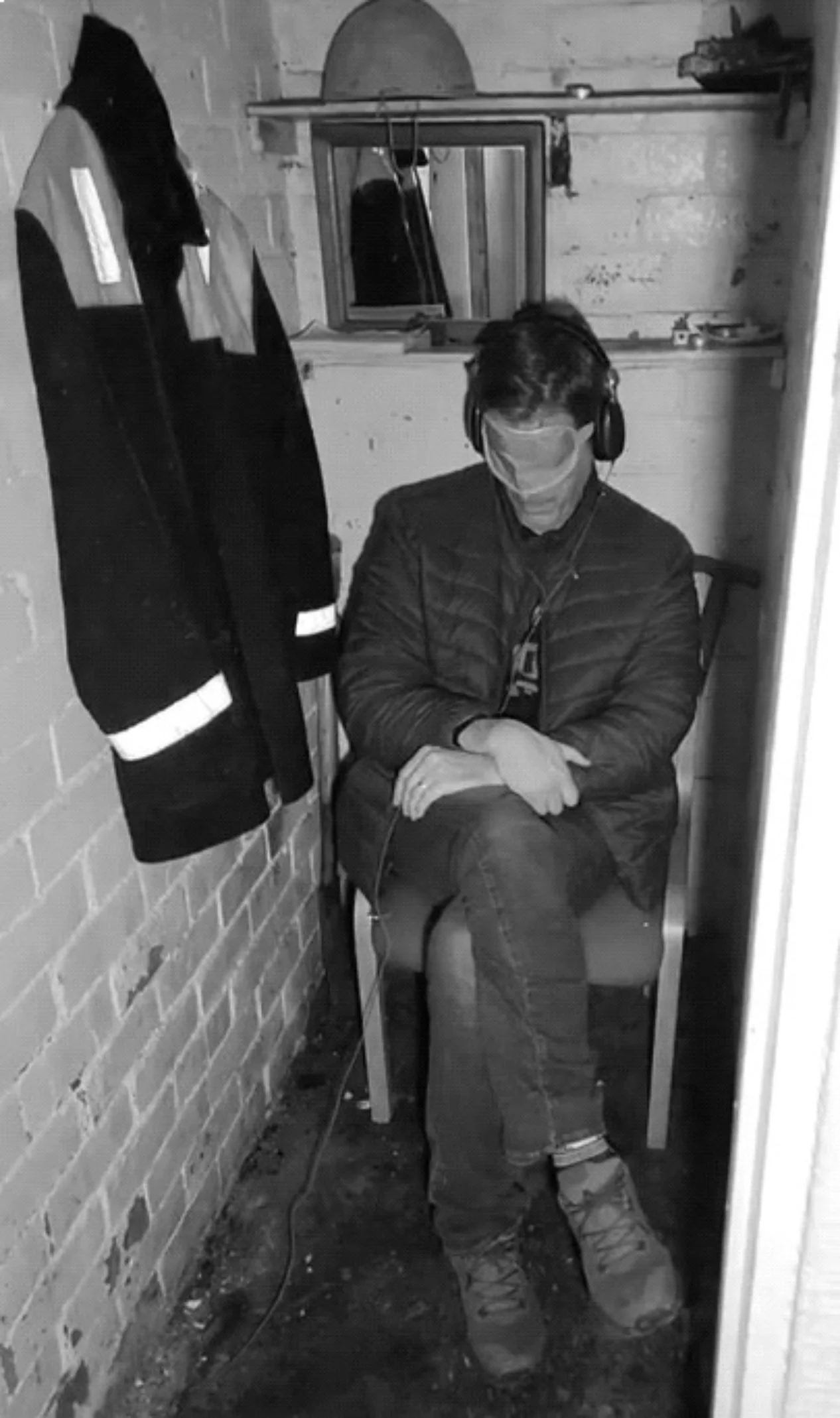 Chris Bader in the coal shed, Pontefract, England. The Retford Ghost Hunters asked him to conduct an experiment in the coal shed where the ‘black monk’ is supposed to attack, wearing headphones and blindfold. The group asked questions Chris couldn’t hear, and he was invited to shout out if either something touched him, or he heard a ‘response’ to their question.