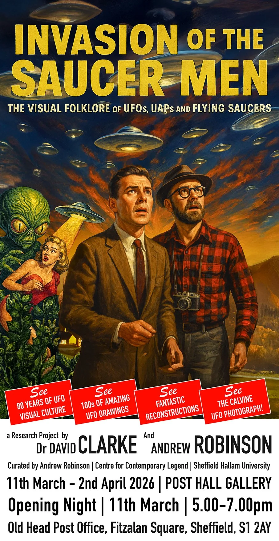 Invasion of the Saucermen: The Visual Folklore of UFOs takes place at the Post Hall, Old Head Post Office, Fitzalan Square, Sheffield, between Thursday, 12 March and Thursday, 2 April 2026. The gallery space is open 10am - 4pm. The preview event will be held on the evening of Wednesday 11 March from 5.00 – 7.30pm.