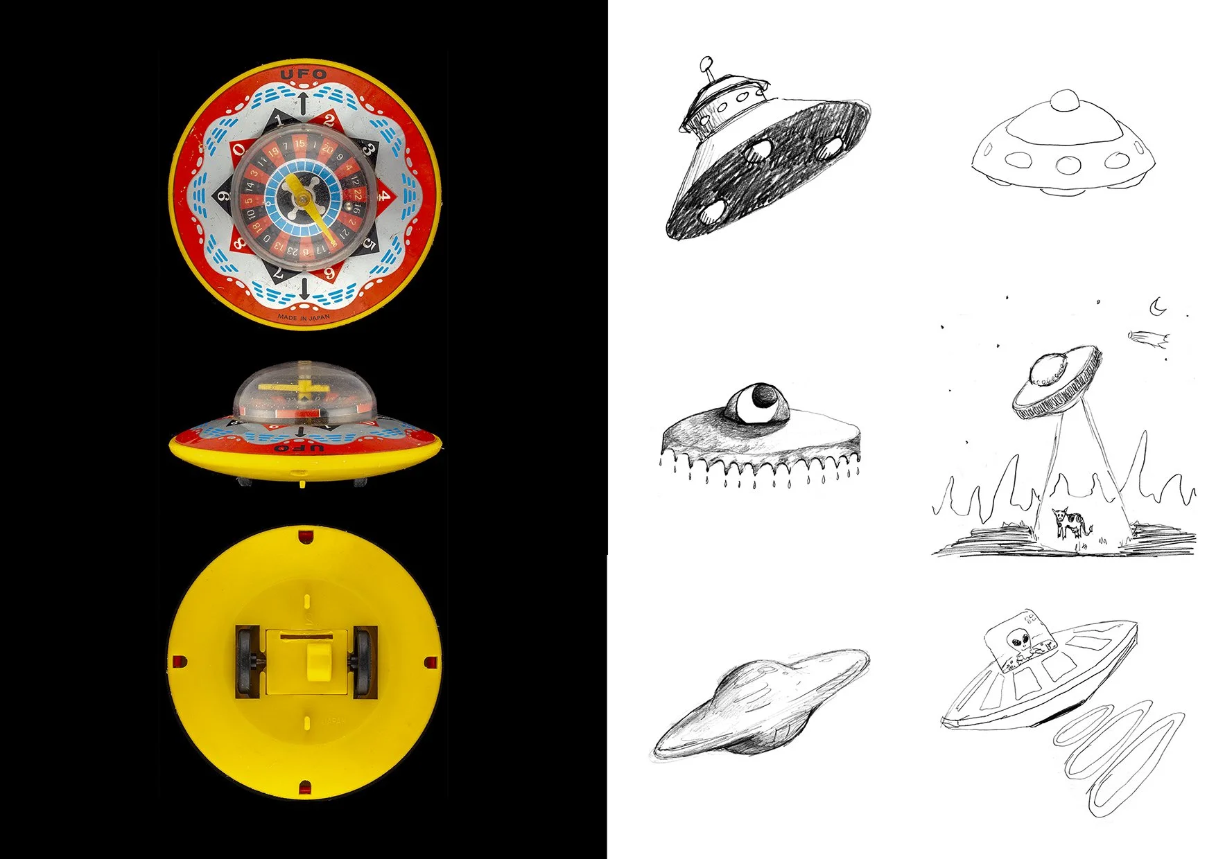 My colleague Dr David Clarke is a world-renowned researcher in the folklore surrounding UFO and UAP sightings and in the summer of 2022 he asked me to analyse the only existing photographic print of the infamous Calvine UFO sighting which he’d recently discovered after many years of searching. This led me to realise the important role that photography often plays in sightings and became fascinated by the history of visual representations of these phenomena. We then began a joint research project to investigate this further and began hosting participatory events and talks at which we collected the drawings you see in the exhibition.